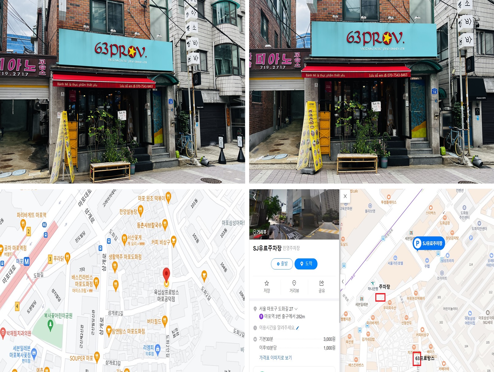 개인차량으로 오실 때는 네비에 서울 마포구 도화 2안길 10을 찍고 오시면 되지만 매장 앞으로 아파트 입구가 있어서 주변으로 약간의 공터가 존재하지만 인근에 마땅히 주차할 곳이 없어서 근처 유료 주차장을 이용하셔야 합니다. 성진 주차장은 30분이 기본으로 3,000이고, 추가로 10분에 1,000원으로 다소 비싼 편이지만 인근 주차장들이 다 비슷한 가격이니 프로방스와 가장 가까운 곳으로 가시면 됩니다.