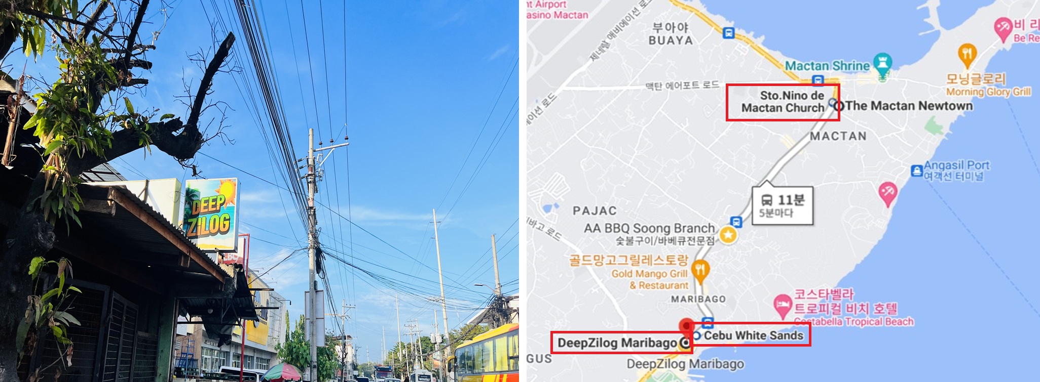 딥질로그를 가시는 공식 버스는 MI-02B 버스가 가는데, 막탄 뉴타운의 삼거리의 교회 앞인 Sto.Nino de Mactan Church 승차> Cebu White Sands 하차 > 도보 120미터입니다.