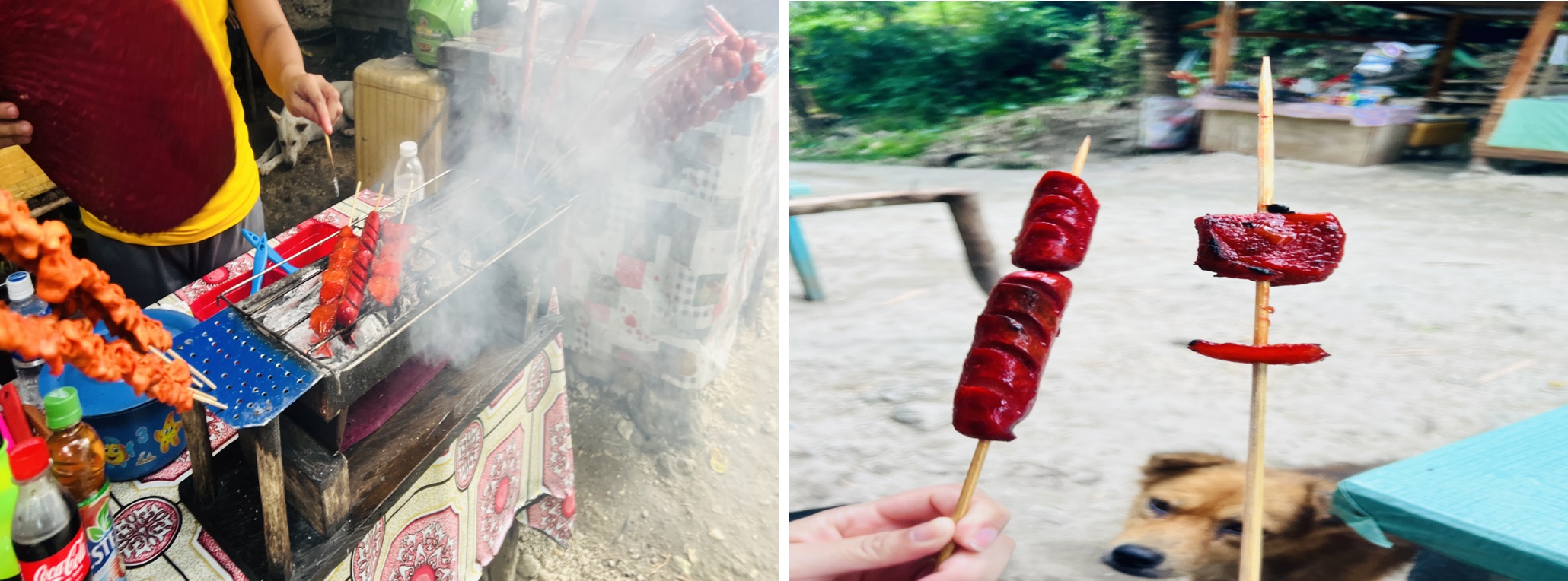처음에 저희는 여기서 식사를 주시는 줄 알고 앉아서 기다리다가 꼬치 몇 개랑 음료를 먹었는데 꼬치는 개당 50페소(1,200원) 이온 음료는 100페소(2,400원) 가었습니다. 나중에 다른 곳에서 먹어보니 세상에 마상에 이곳이 엄청나게 비싸다는 것을 알았습니다. 하지만 2시간을 걷고 수영하고 점프하고 나니 목도 마르고 이 앞으로 지나갈 때 굽는 냄새가 참기 힘들어서 맛있게 먹었습니다.